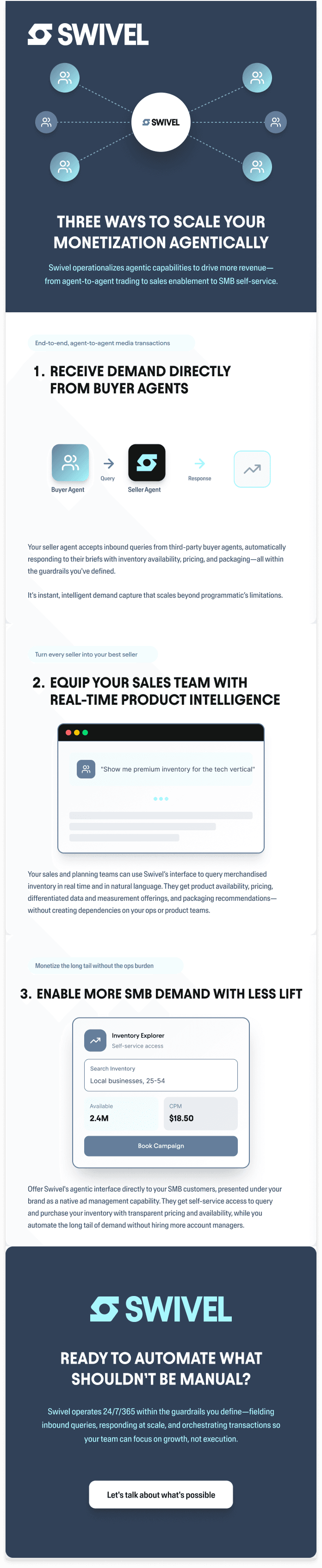 From agent-to-agent transactions to sales enablement to scalable self-service, Swivel lets you monetize in more ways, at speed and scale—on your terms.